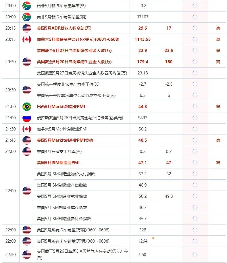 20:15 美国5月ADP就业人数变动(万) , 前值 29.6 , 预期值 17 , 公布值:待发布20:15 加拿大5月储备资产合计(亿美元)(0601-0608) , 前值 1143.55 , 预期值 -- , 公布值:待发布