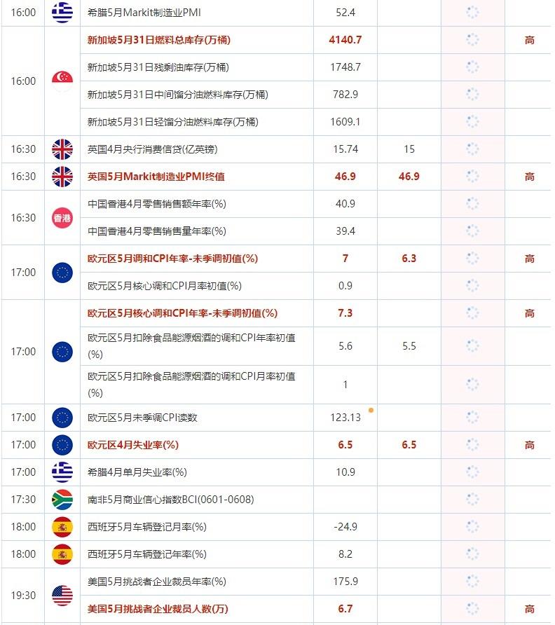 17:00 欧元区5月核心调和CPI年率-未季调初值(%) , 前值 7.3 , 预期值 -- , 公布值:待发布17:00 欧元区5月扣除食品能源烟酒的调和CPI年率初值(%) , 前值 5.6 , 预期值 5.5 , 公布值:待发布