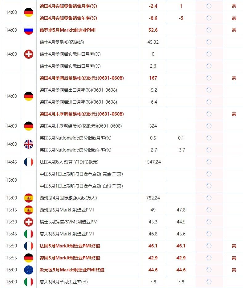 14:00 德国4月实际零售销售月率(%) , 前值 -2.4 , 预期值 1 , 公布值:待发布14:00 德国4月实际零售销售年率(%) , 前值 -8.6 , 预期值 -5 , 公布值:待发布14:00 俄罗斯5月Markit制造业PMI , 前值 52.6 , 预期值 -- , 公布值:待发布