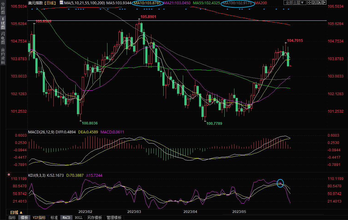 美元指数周四下跌0.65%,收报103.54,为逾一周最低收盘价,脱离周三触及的两个月高点104.7,目前汇价已经连续失守5日均线和10日均线,KDJ死叉运行,MACD也有死叉趋势,短线可能会进一步试探100日均线102.92附近支撑。