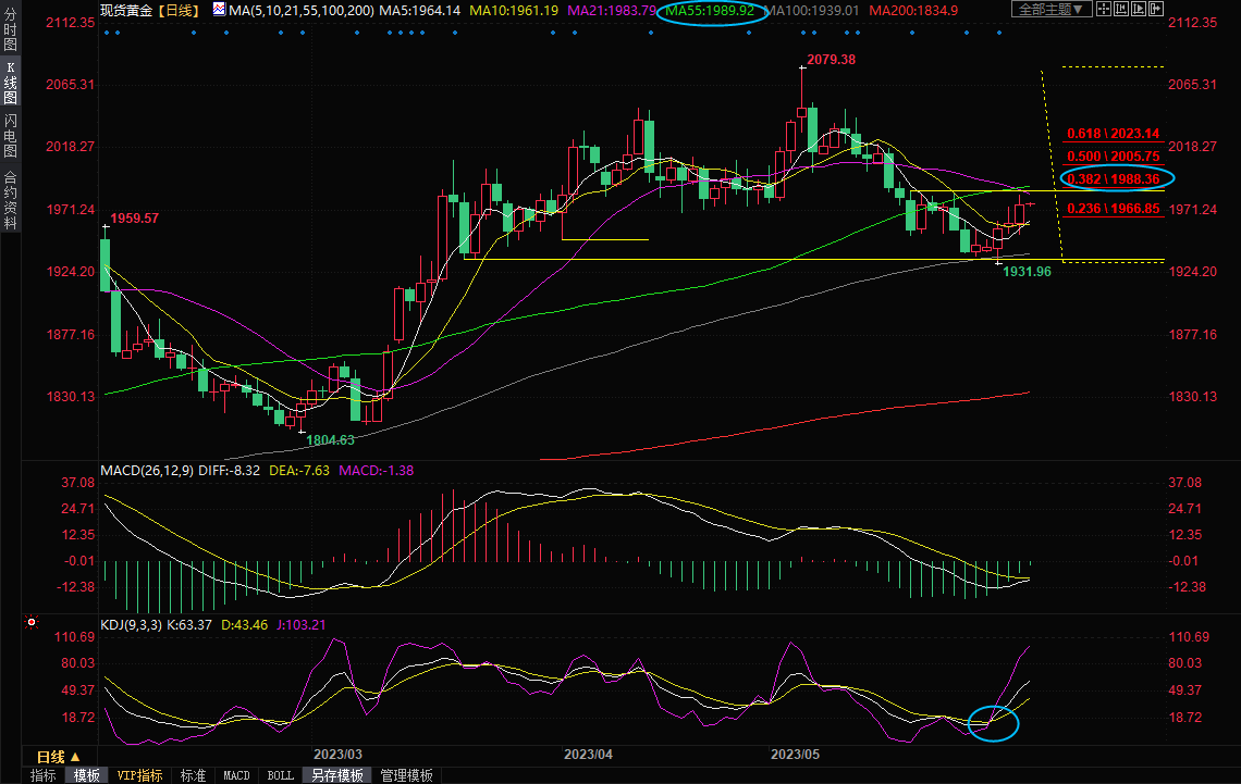 整体来看,美国经济数据表现不佳,美联储6月份加息预期的进一步下降主导市场走势,美元指数大跌,美债收益率持续下跌,都给金价提供支撑,市场还预计美国失业率将上升,短线金价存在进一步反弹机会, 关注38.2%回撤位1988.36附近阻力,若能顶破该阻力,则有望进一步涨向2000关口附近。不过,由于欧洲央行仍将进一步加息,美国债务违约风险下降,这可能会令多头有所顾忌,仍需提防金价冲高回落的可能性。北京时间09:58,