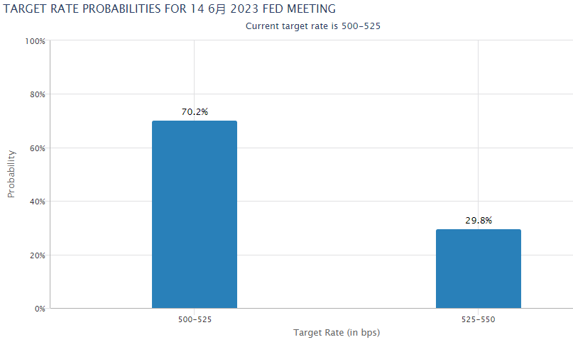 "……美国的政治风险可能会继续提升黄金的吸引力,即使在目前的债务上限问题得到解决之后。如果法定债务上限被延长至2025年1月,随之而来的政治争吵可能会放大围绕2024年美国总统选举的风险。"市场焦点重新转向美联储利率前景。美联储官员周三(5月31日)暗示6月将“跳过”加息,促使市场预期迅速逆转。根据CME的“联储观察”工具显示,目前市场预期美联储将在6月会议上加息25个基点的可能性约为不到30%。该数据此前曾一度高达逾60%。