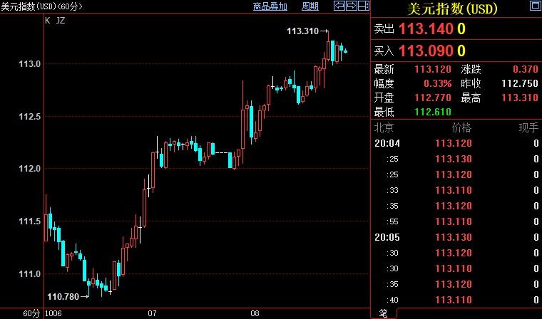 美元指数上涨0.31%至113.121。