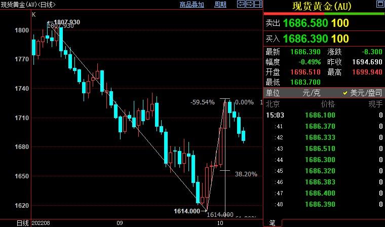 现货黄金下跌1.08%至1676.83美元/盎司;COMEX期金主力合约下跌1.47%至1684.1美元/盎司;