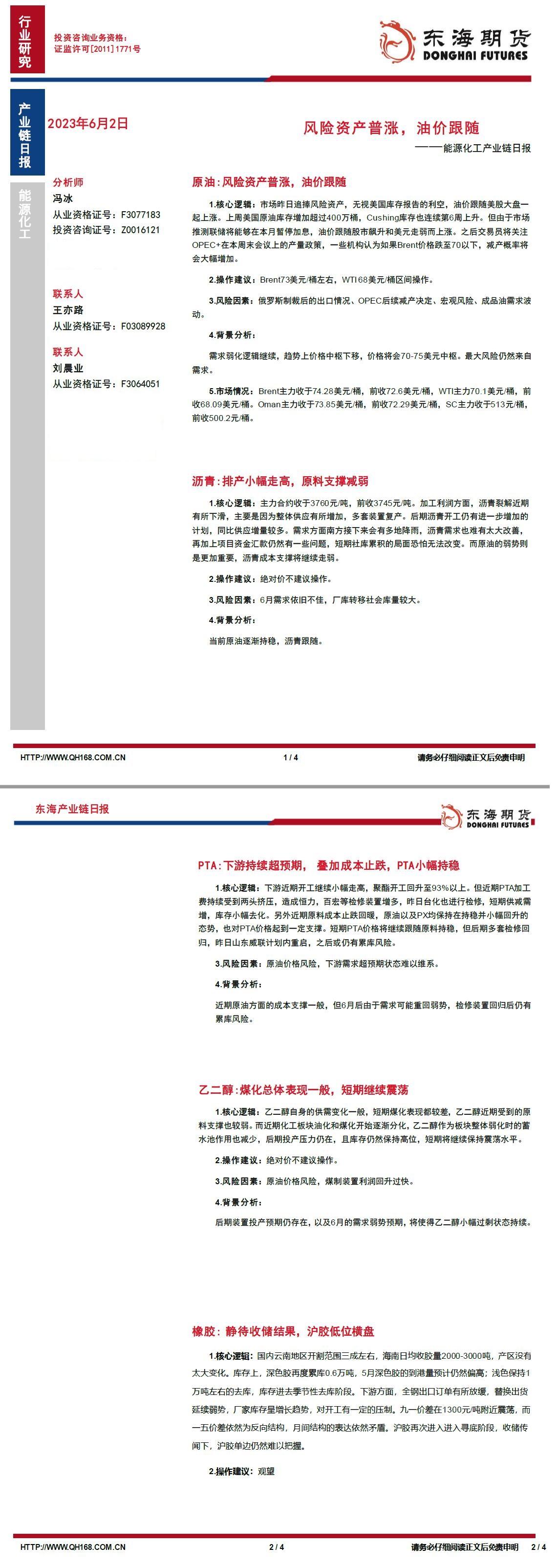 标题:【东海期货6月2日产业链日报】能化篇:风险资产普涨,油价跟随