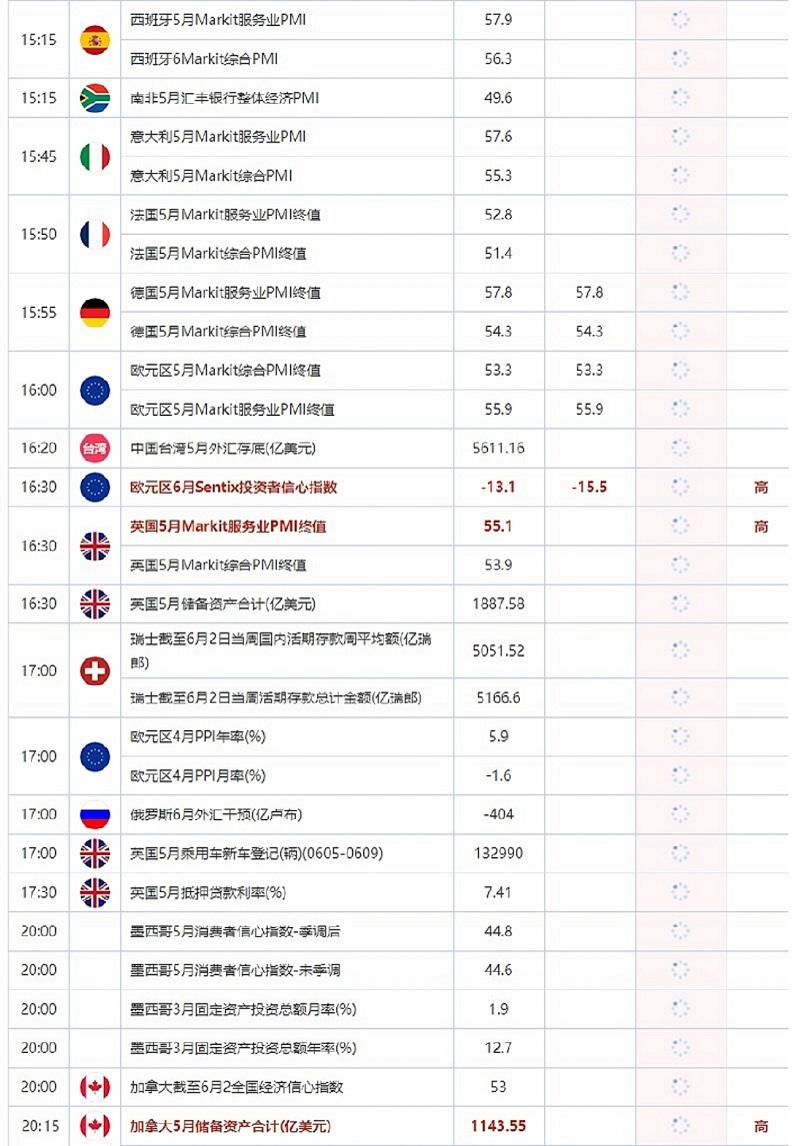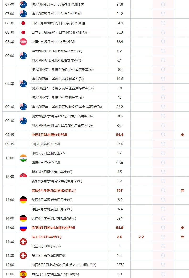 09:45 中国5月财新服务业PMI , 前值 56.4 , 预期值 -- , 公布值:待发布09:45 中国6财新综合PMI , 前值 53.6 , 预期值 -- , 公布值:待发布