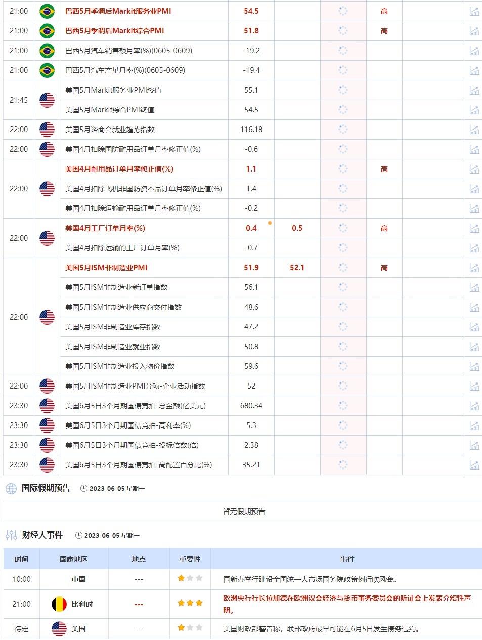 22:00 美国5月ISM非制造业PMI , 前值 51.9 , 预期值 52.1 , 公布值:待发布22:00 美国5月ISM非制造业新订单指数 , 前值 56.1 , 预期值 -- , 公布值:待发布