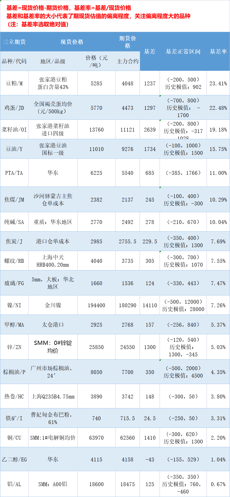 三立期货10月12日基差:一张图尽览有色金属、黑色系、能源化工和农产品基差(按基差率从大到小排序)