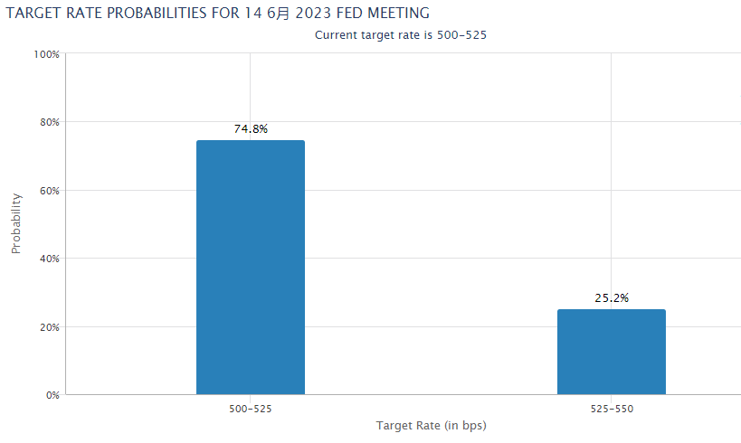 根据CME的“联储观察”工具,交易员预计美联储在6月13日至14日的政策会议上维持利率不变的可能性为74.8%,到年底前联邦基金利率将保持在5%以上。