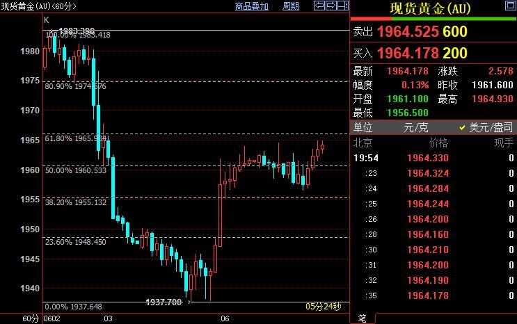 现货黄金上浮0.14%至1964.52美元/盎司;COMEX期金主力合约上涨0.33%至1980.9美元/盎司;