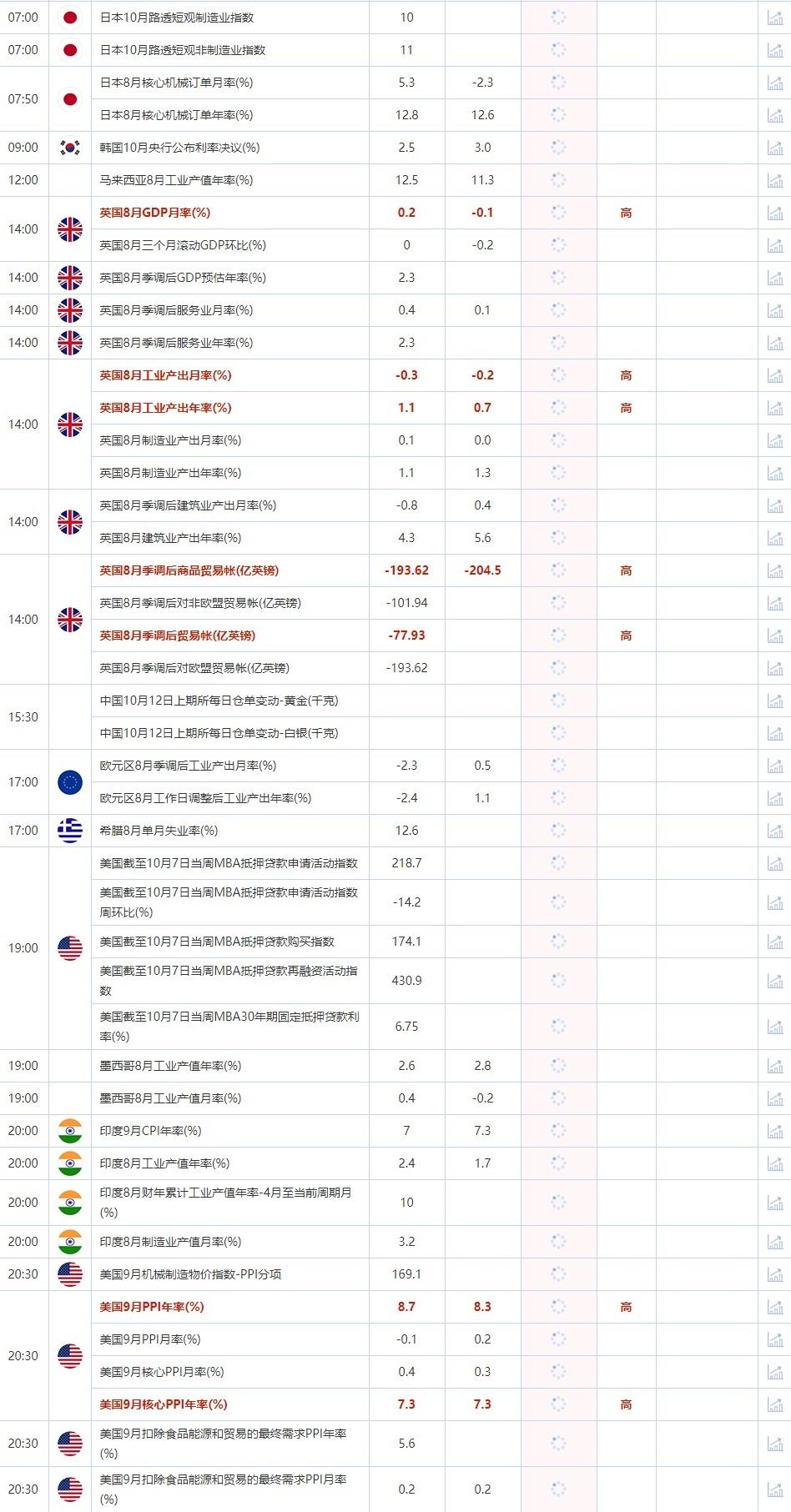 2022年10月12日,全球主要经济体将公布经济数据,需重点关注英国8月GDP月率,英国8月工业产出月率,英国8月工业产出年率,英国8月季调后商品贸易帐,英国8月季调后贸易帐,美国9月PPI年率, 大事方面需关注:韩国央行公布利率决议,OPEC公布月度原油市场报告,欧洲央行行长拉加德发表讲话,明尼阿波利斯联储主席卡什卡利发表讲话,G20财长和央行行长会议举行,至10月13日。