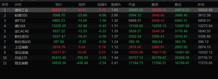 美股收盘情况:道琼斯工业指数涨0.12%,至29239.32点;