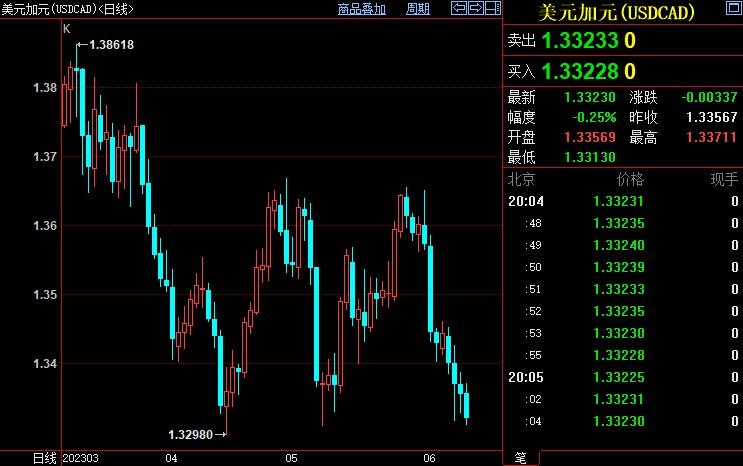 美元兑加元跌创逾一个月新低至1.3320。