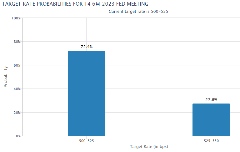 根据CME的“联储观察”工具显示,交易员现在认为美联储下周升息25个基点的机率为27.6%,暂停升息的概率为72.4%。然而,市场认为7月26日会议重新加息的机率为67.1%。