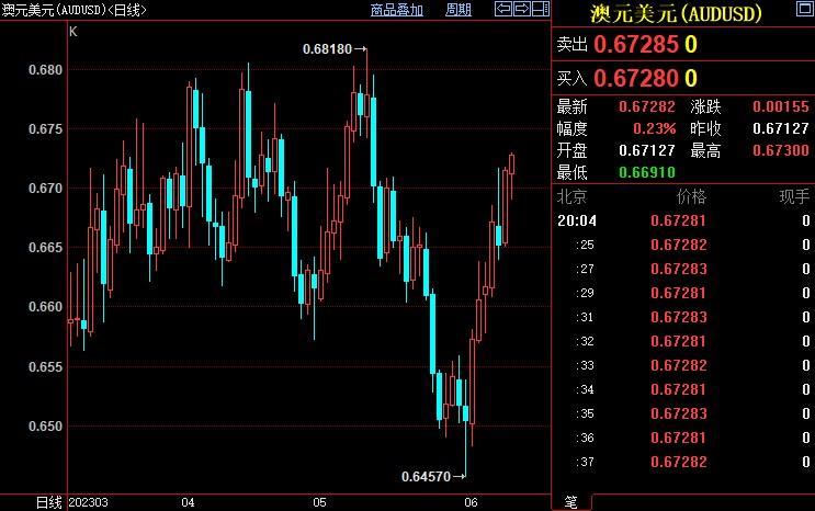 澳元兑美元升至近一个月新高0.6723。