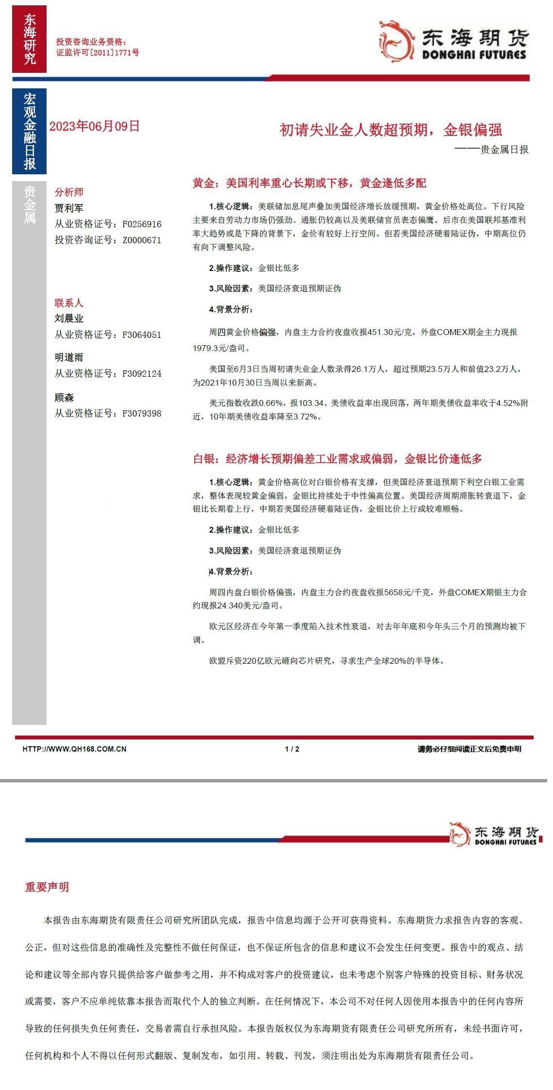 标题:【东海期货6月9日产业链日报】贵金属篇:初请失业金人数超预期,金银偏强