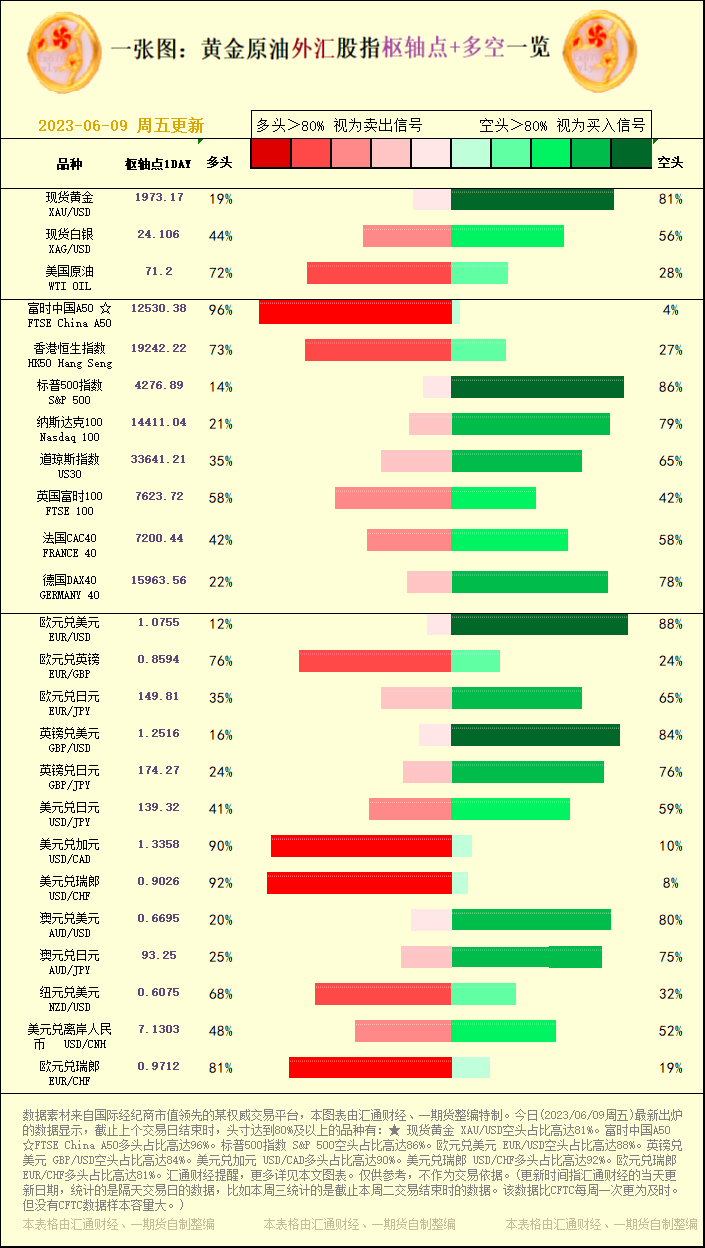 标题:一张图:2023/06/09黄金原油外汇股指"枢纽点+多空占比"一览