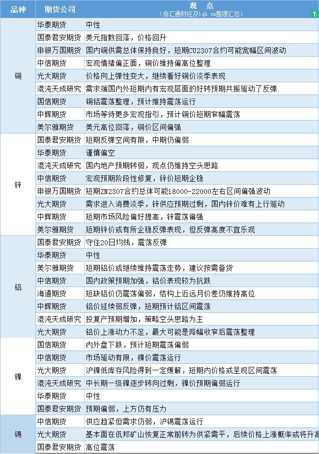标题:期货公司观点汇总一张图:6月9日有色系(铜、锌、铝、镍、锡等)