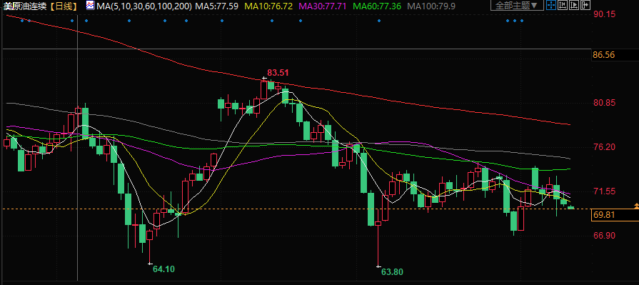 美原油交投于69.95美元/桶附近;油价上周连续第二周下跌,因在沙特阿拉伯上周末决定减产后,美国燃料库存的增加和疲软的数据增加了对需求增长的疑虑。