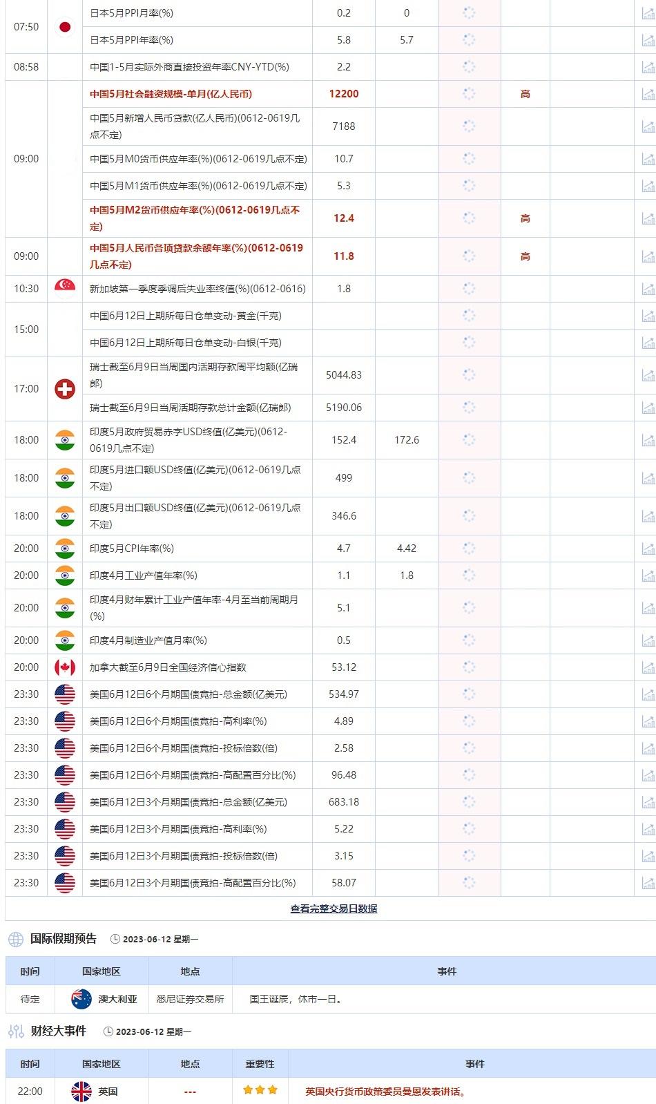 汇通财经APP讯——6月12日,投资者需要关注的重点数据:中国5月社会融资规模-单月,中国5月M2货币供应年率,中国5月人民币各项贷款余额年率,加拿大截至6月9日全国经济信心指数。需要关注的大事件包括英国央行货币政策委员曼恩发表讲话;澳大利亚悉尼证券交易所国王诞辰,休市一日。