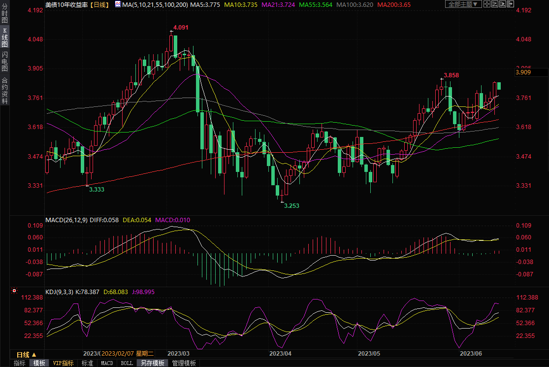 10年期美国国债收益率周二上涨7.4个基点至3.839%,为5月29日以来最高收盘价,涨幅约2%。周三亚市10年前美债收益率小幅回落,目前交投于3.808%附近。