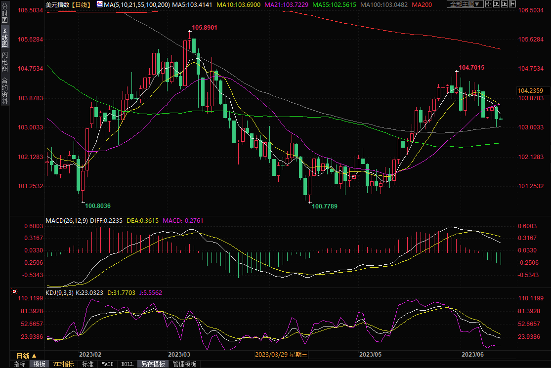 美元指数最低下滑至103.04,为5月23日以来新低,尾盘下跌0.3%,报103.29。不过,美元的下跌部分是因为市场对欧洲央行和英国央行加息预期的升温,所以给金价的支撑相对有限。