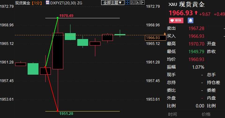 现货黄金短线剧震近20美元,低点和高点分别是1951.28美元/盎司和1970.49美元/盎司。