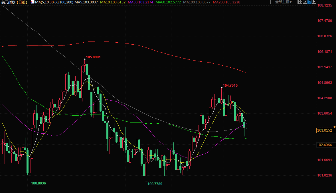 美元指数尾盘下跌0.3%,报103.01,盘中触及四周低点102.66。