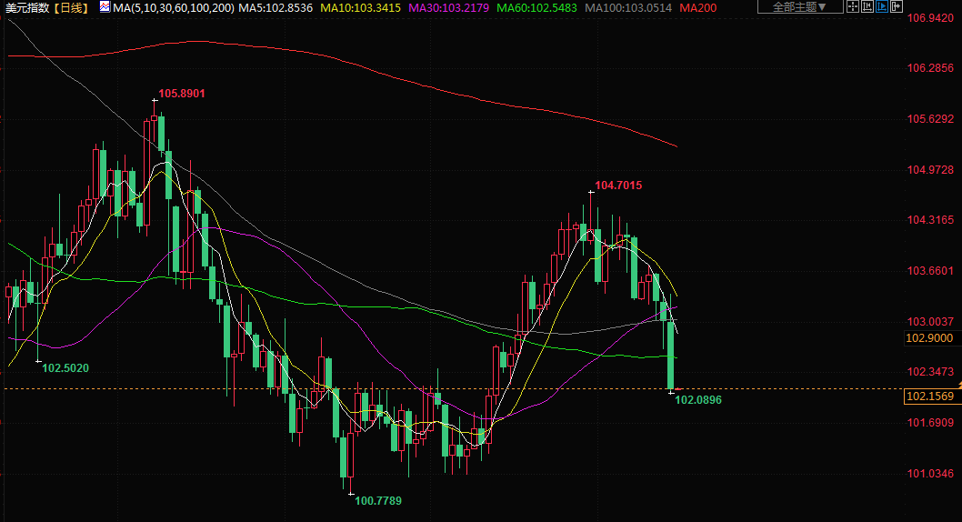 美元指数尾盘下跌0.8,报102.11。盘中早些时候,该指数跌至102.08,创下五周以来的新低。