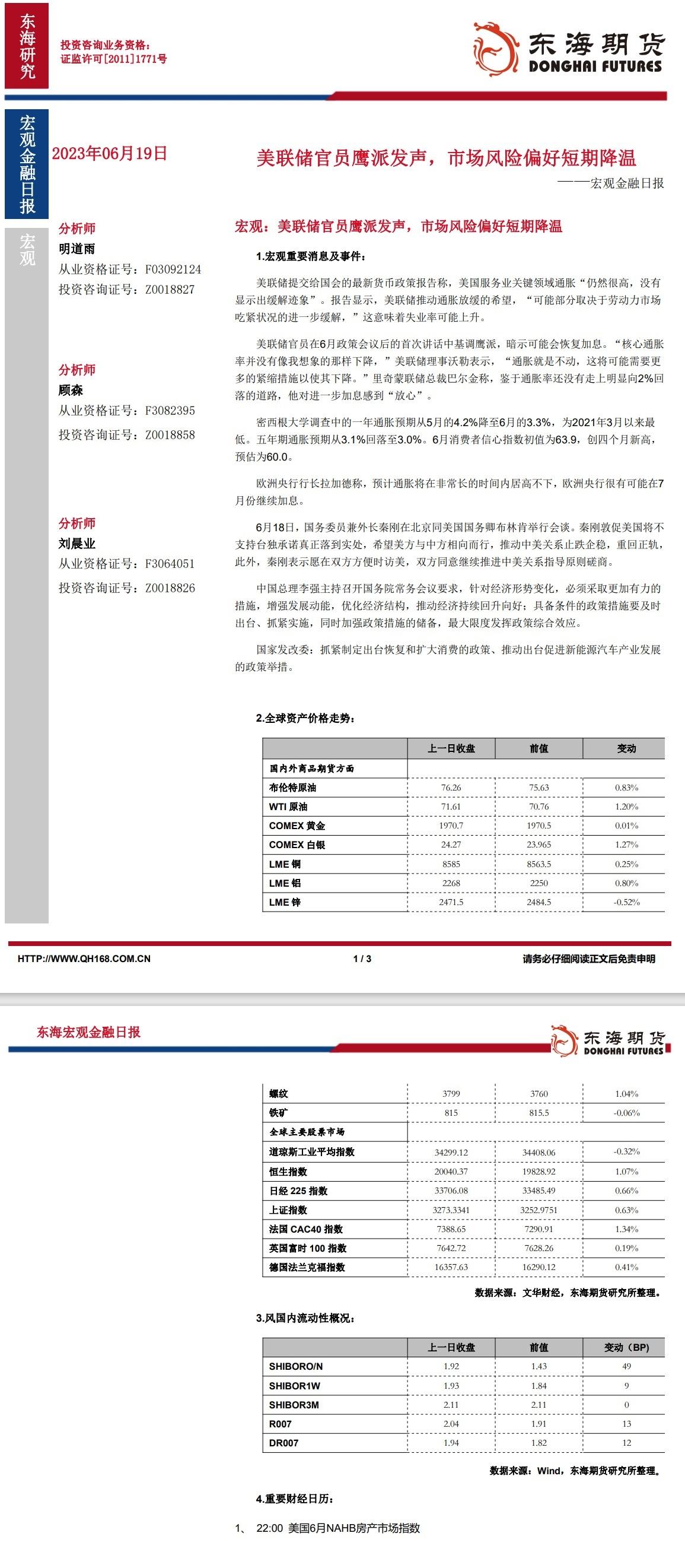 标题:【东海期货6月19日宏观金融日报】:美联储官员鹰派发声,市场风险偏好短期降温