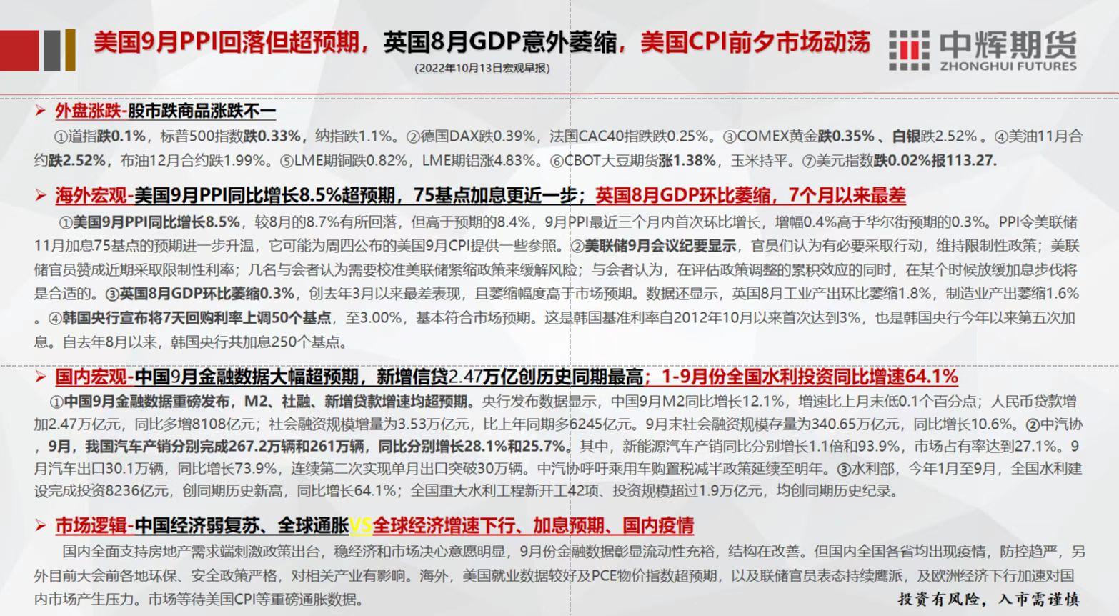 中辉期货宏观早报:美国9月PPI回落但超预期,英国8月GDP意外萎缩,美国CPI前夕市场动荡