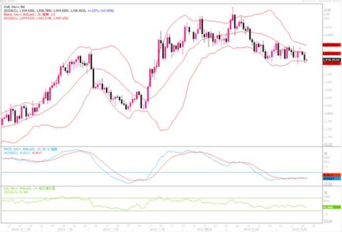 价格仍处在横盘震荡区间内,但走势处在布林带中轨线之下,暂时未能解除近期偏向下行的风险。若横盘区间下方的强支撑水平1930破位,则下滑的目标看向1900心里关口,进一步下滑看向1850美元。而当前横盘震荡区间的上方1970-1980美元区域似乎阻力较强,多头攻破之的欲望不强。