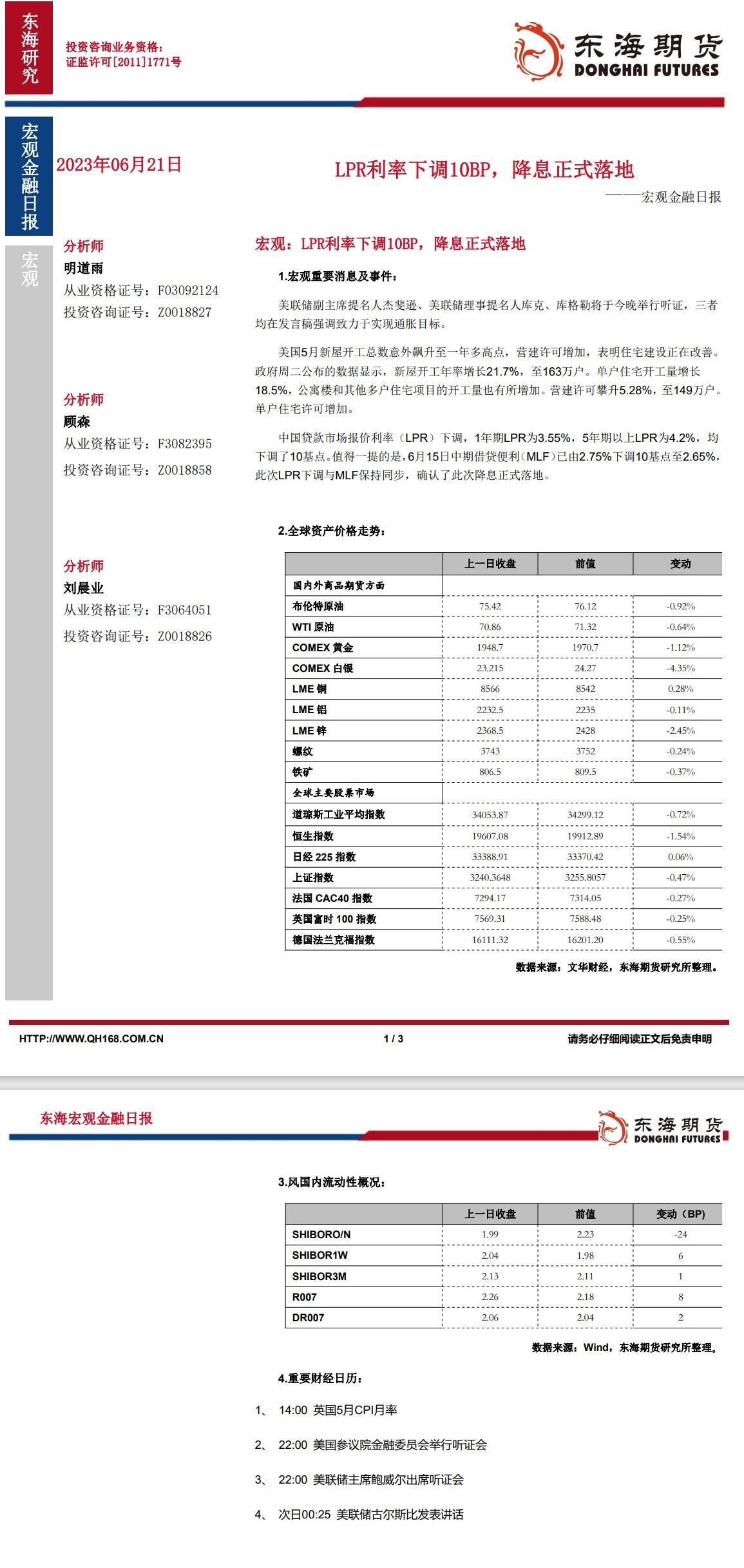 标题:【东海期货6月21日宏观金融日报】:LPR利率下调10BP,降息正式落地