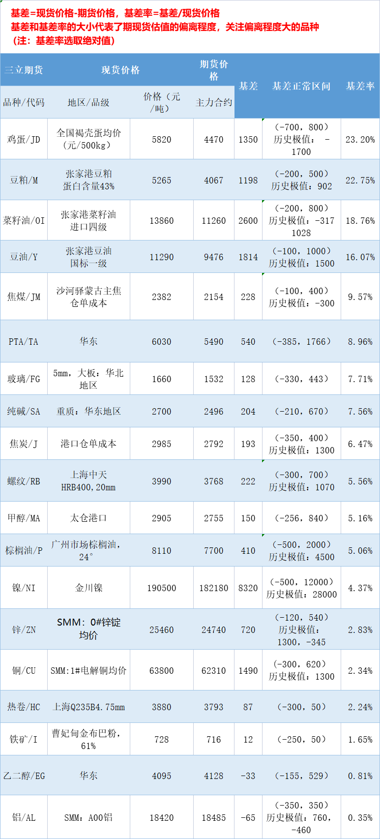 三立期货10月13日基差:一张图尽览有色金属、黑色系、能源化工和农产品基差(按基差率从大到小排序)
