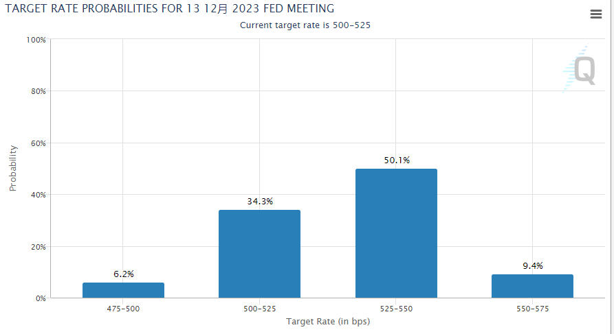 根据CME的“联储观察”工具最新显示,交易员目前预计美联储7月加息25个基点至5.25%-5.50%区间的可能性约为77%,但此后到今年年底美联储将保持利率不变。在上周暂停加息后,美联储表示年内还将加息50个基点。