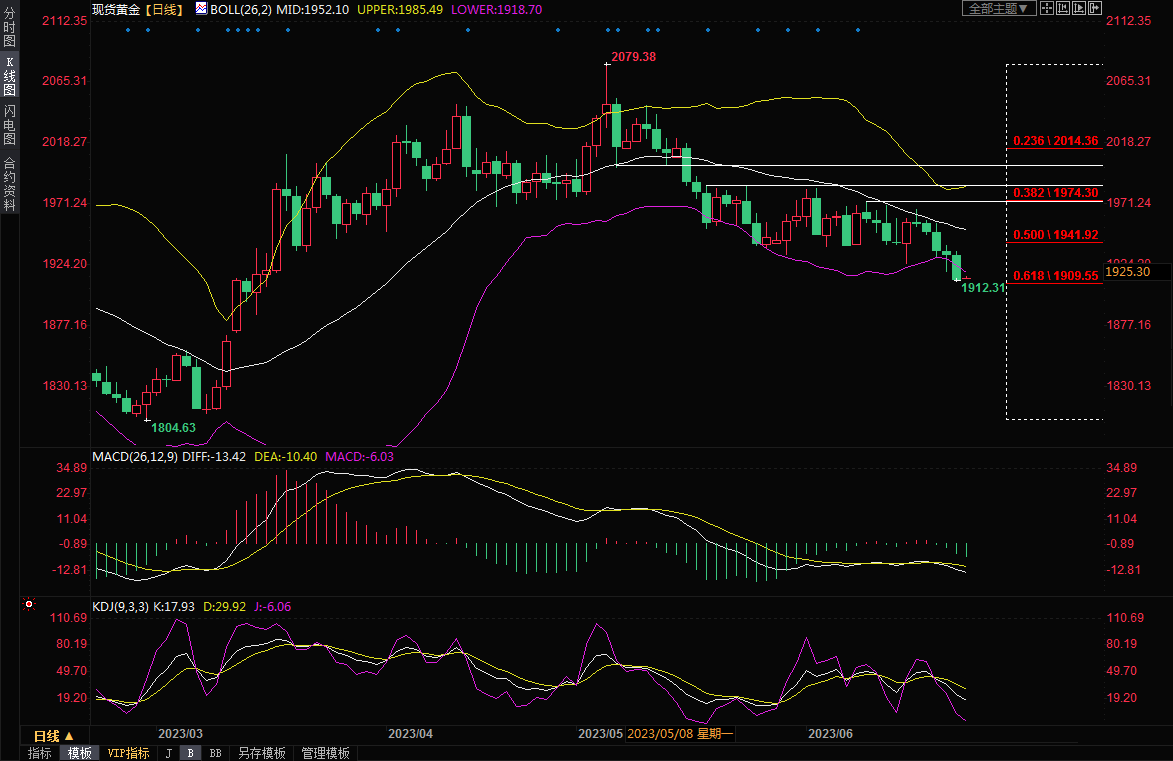 整体来看,虽然美国劳动力市场出现了一些疲软迹象,一些官员对美联储7月份是否加息仍存观望态度,地缘局势紧张,有望给金价提供一些支撑,但美联储更多官员偏向鹰派,而且英国央行加息幅度超过市场预期,全球多数央行面临进一步加息压力,这会增加持有黄金的机会成本,而且美元指数企稳反弹,黄金技术面看空信号增加,短线面临进一步下行风险,可能会试探1900整数关口附近支撑。北京时间09:20,