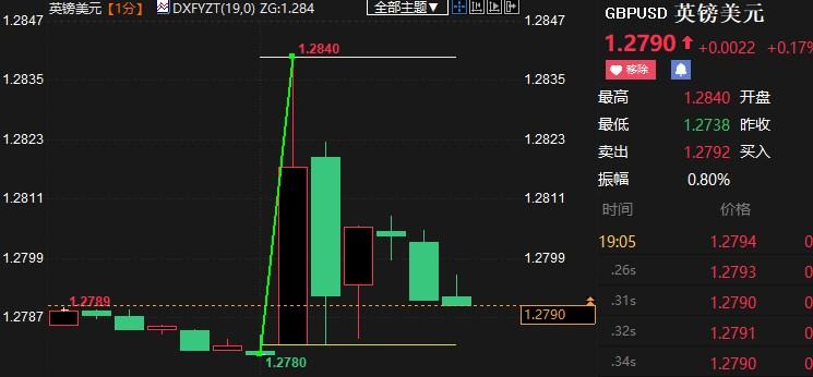 英镑兑美元冲高回落60点,一度高见1.2840。