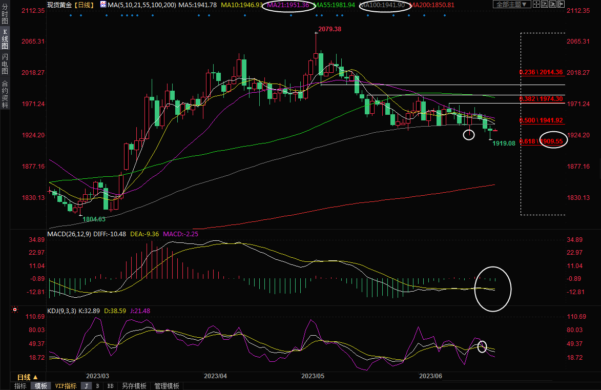震荡下跌;短期均线空头排列,金价也失守100日均线,KDJ死叉,MACD轻微死叉,在收复100日均线1941.90前,金价面积进一步下行风险,初步支撑在上周四低点1924.75附近,隔夜低点支撑在1919.08附近,关键支撑在1909.55附近,该位置是1804-2079涨势的61.8%回撤位,如果失守该位置,则增加中线看空信号。