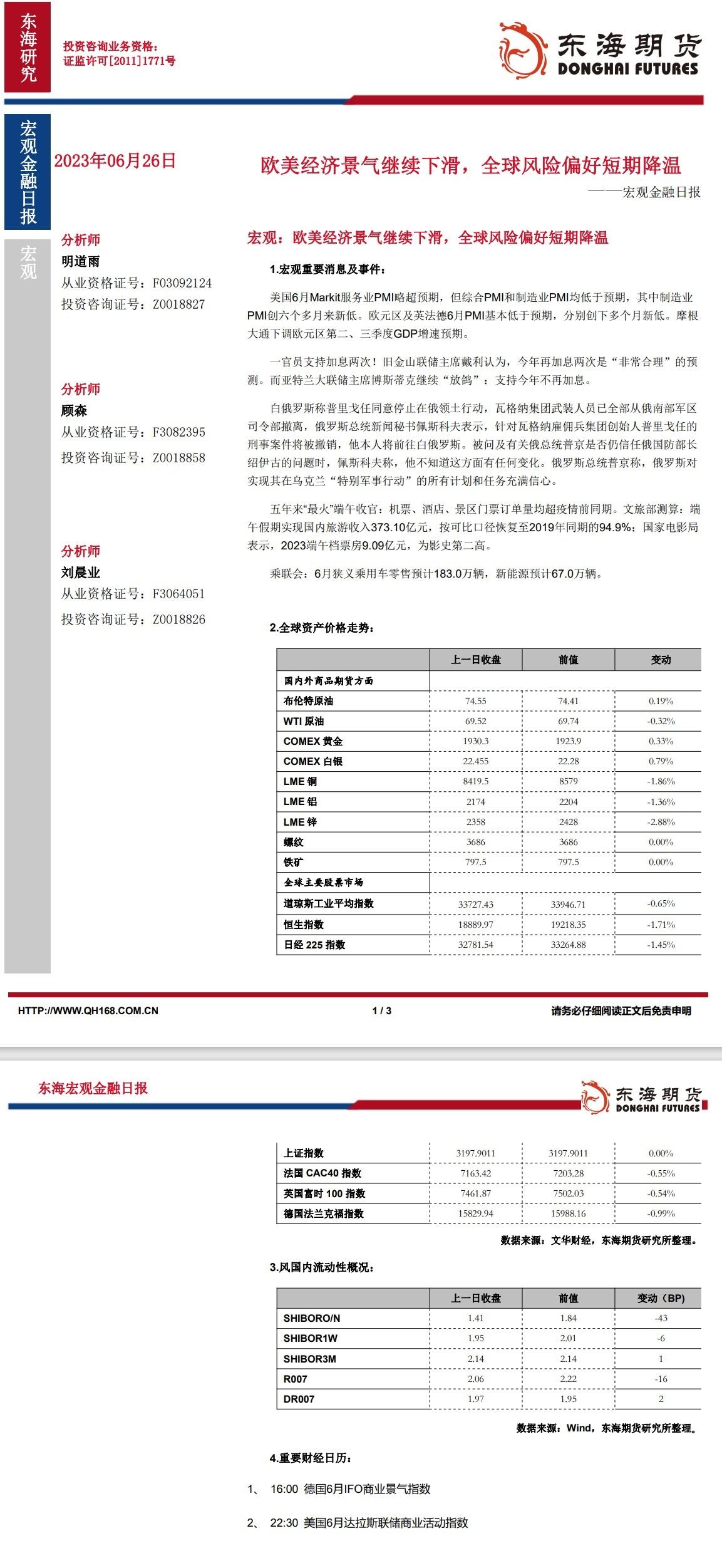标题:【东海期货6月26日宏观金融日报】:欧美经济景气继续下滑,全球风险偏好短期降温