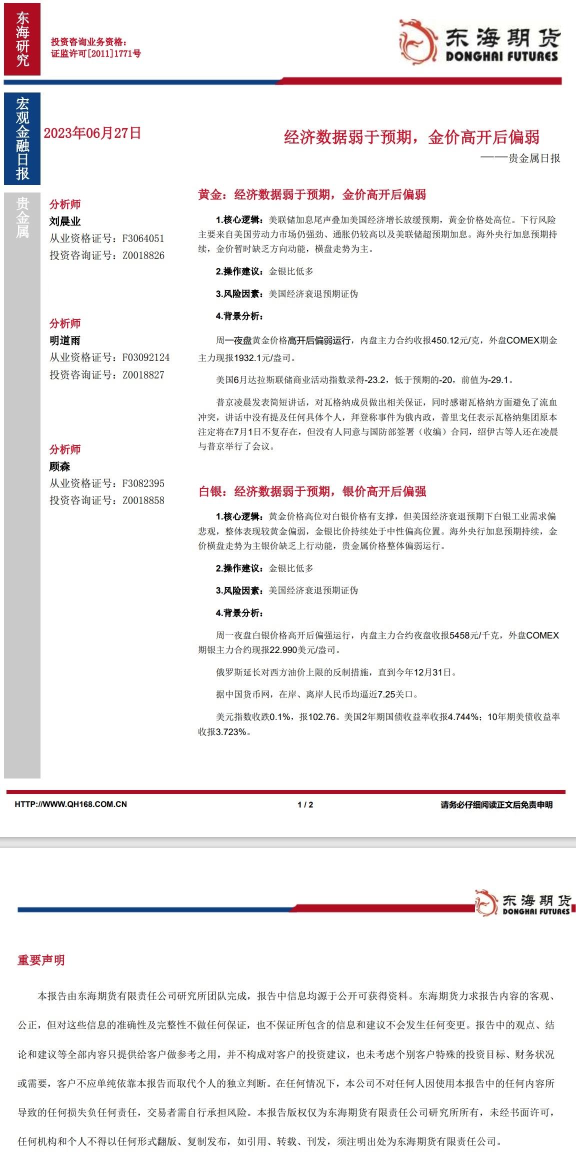 标题:【东海期货6月27日产业链日报】贵金属篇:经济数据弱于预期,金价高开后偏弱