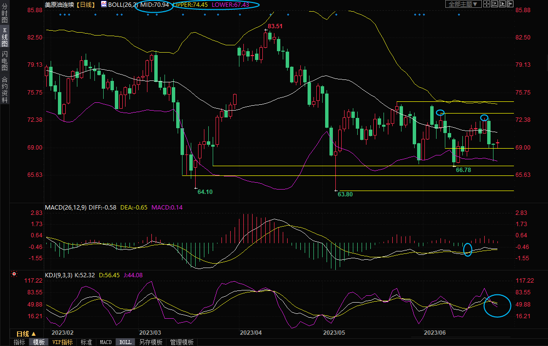 由于KDJ死叉运行,在顶破布林线中轨70.94前,仍需提防油价的震荡下行风险,初步支撑在日内低点69.01附近,布林线下轨支撑在67.43附近,6月12日低点支撑在66.78附近,若跌破该支撑,则增加后市看空信号。