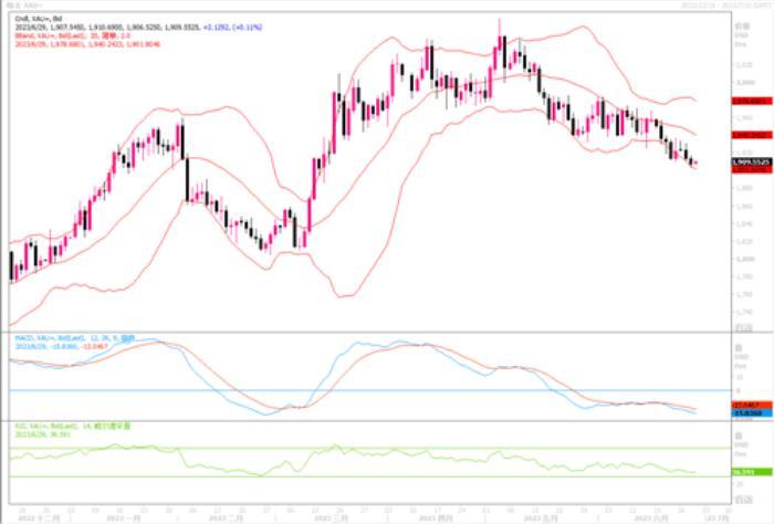 日线图看,昨日金价继续承压下行落录得带有明显实体的阴线K线形态,价格继续承压于短期均线下方, MACD指标双线仍处于死叉运行过程当中,暗示当前整体仍处在弱势走势当中。目前下方强支撑1910美元水平已破,下方将会严重考验1900美元心里整数关口的支撑,若这道防线也失守,后市黄金恐怕要运行到1900美元以下区域一段时间了!