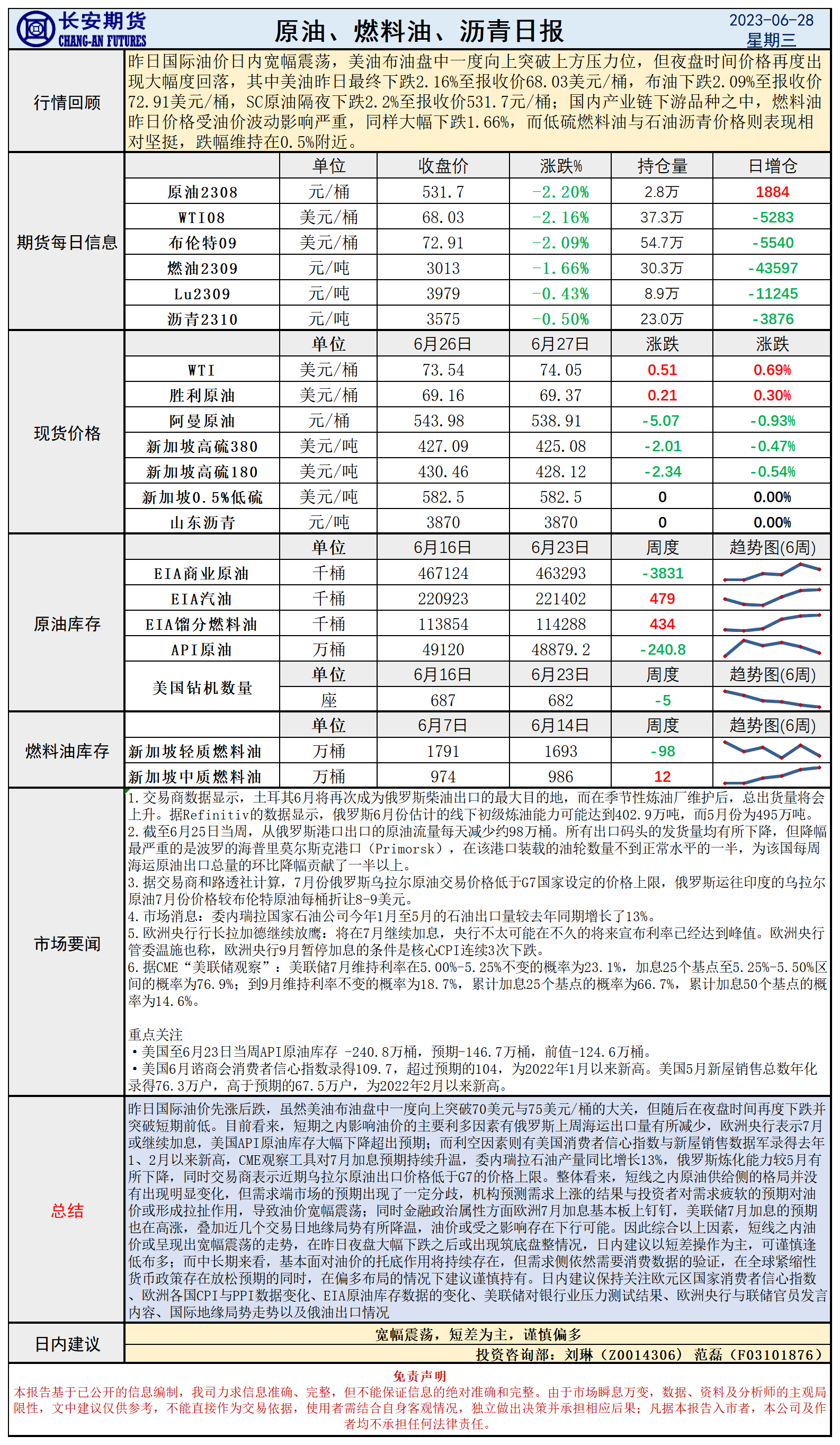 标题:长安期货6月28日原油日报:库存下降提振效果有限,加息预期高涨油价再承压力