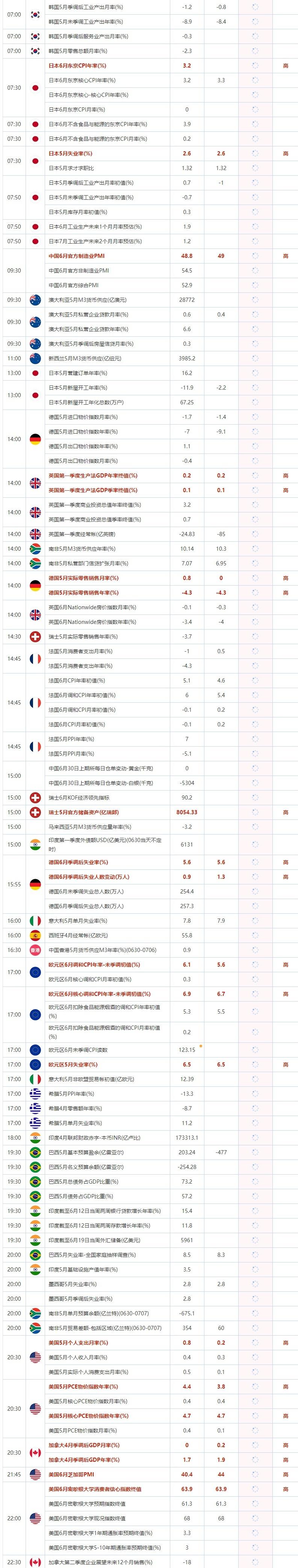 20:30 美国5月PCE物价指数年率(%) , 前值 4.4 , 预期值 3.8 , 公布值:待发布20:30 美国5月核心PCE物价指数月率(%) , 前值 0.4 , 预期值 0.4 , 公布值:待发布