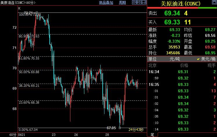小时图上看,NYMEX原油升破69.21美元,短线有望进一步上摸69.88美元,它们分别是72.71美元-67.05美元下跌区间的38.2%斐波那契回档位和50%斐波那契回档位。