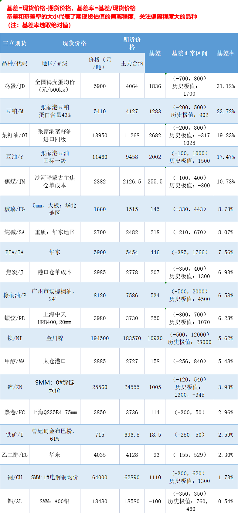 三立期货10月14日基差:一张图尽览有色金属、黑色系、能源化工和农产品基差(按基差率从大到小排序)