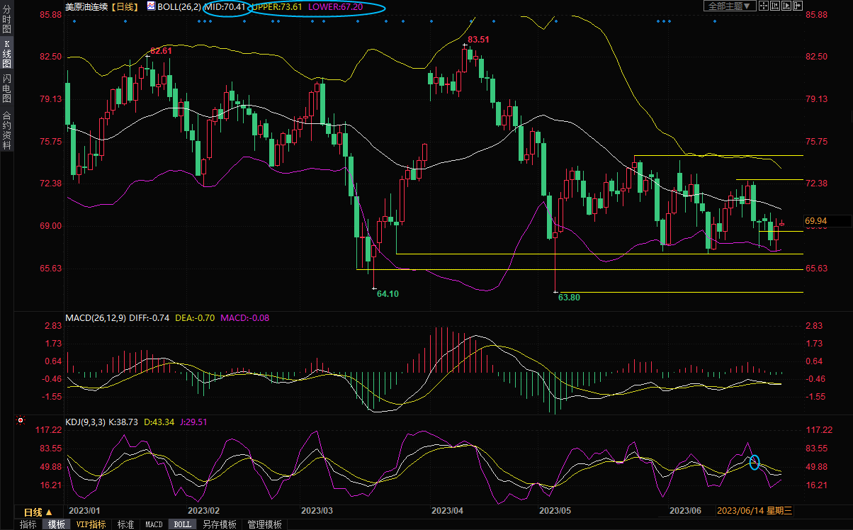 震荡;油价再度在布林线下轨和近期震荡区间下沿附近获得支撑后反弹,后市有望向近期震荡区间震荡上沿运行,短线的话,布林线中轨阻力在70.40附近,若能顶破该阻力,则增加短线看涨信号;进一步阻力在6月21日高点72.69附近,布林线上轨阻力在73.62附近5月24日高点阻力在74.71附近。需要顶破该阻力,才能打开中线上涨通道。