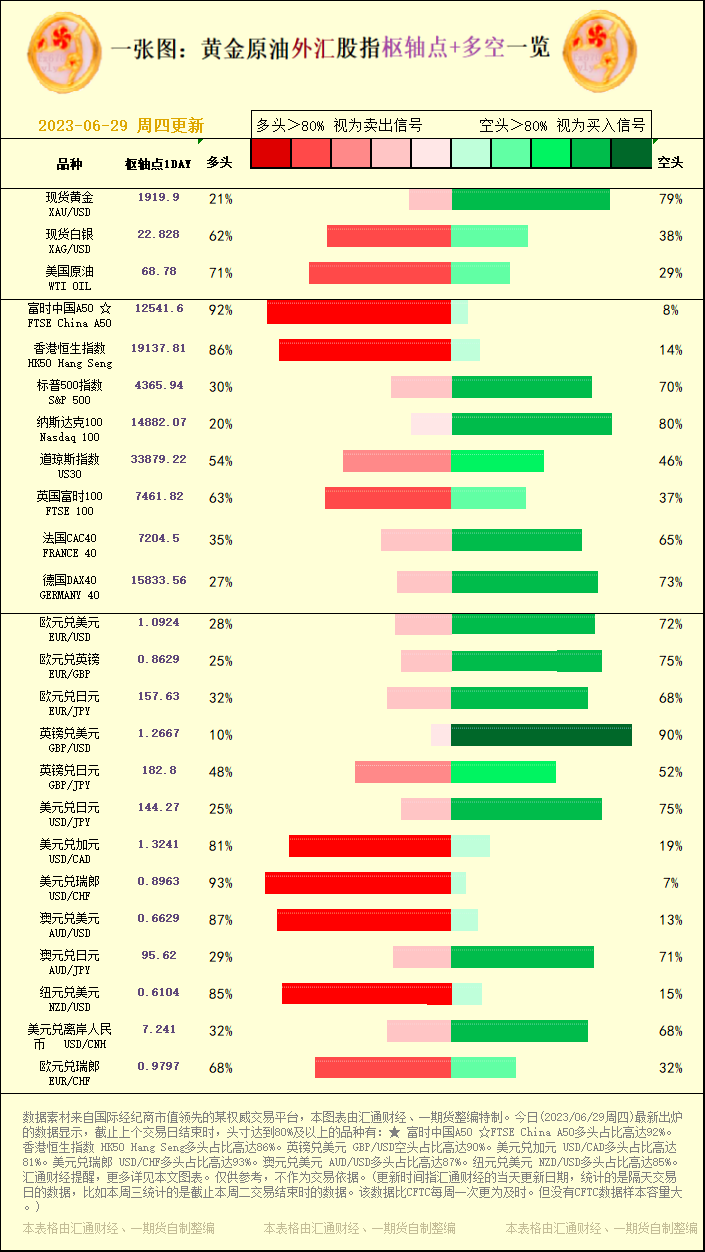 标题:一张图:2023/06/29黄金原油外汇股指"枢纽点+多空占比"一览