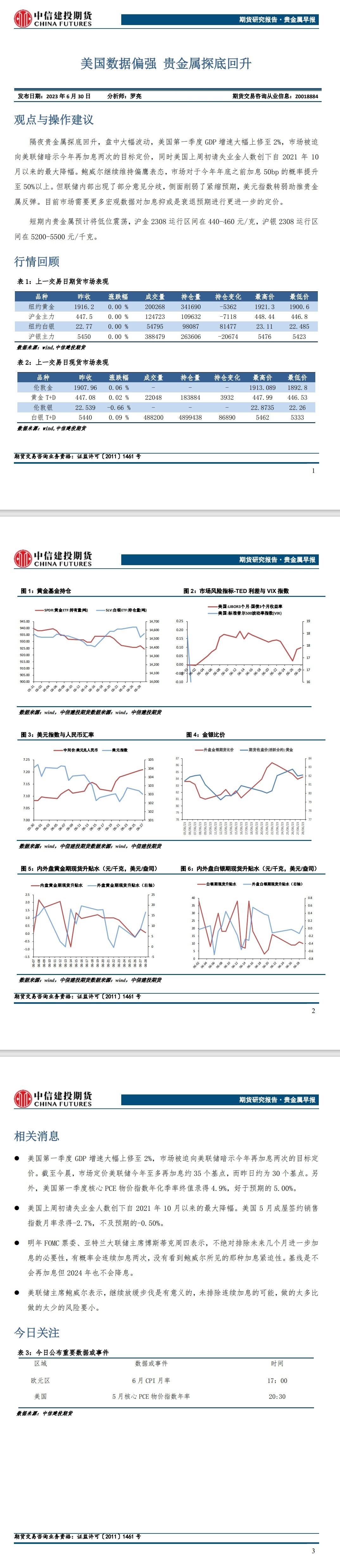 中信建投期货6月30日贵金属报告:美国数据偏强 贵金属探底回升