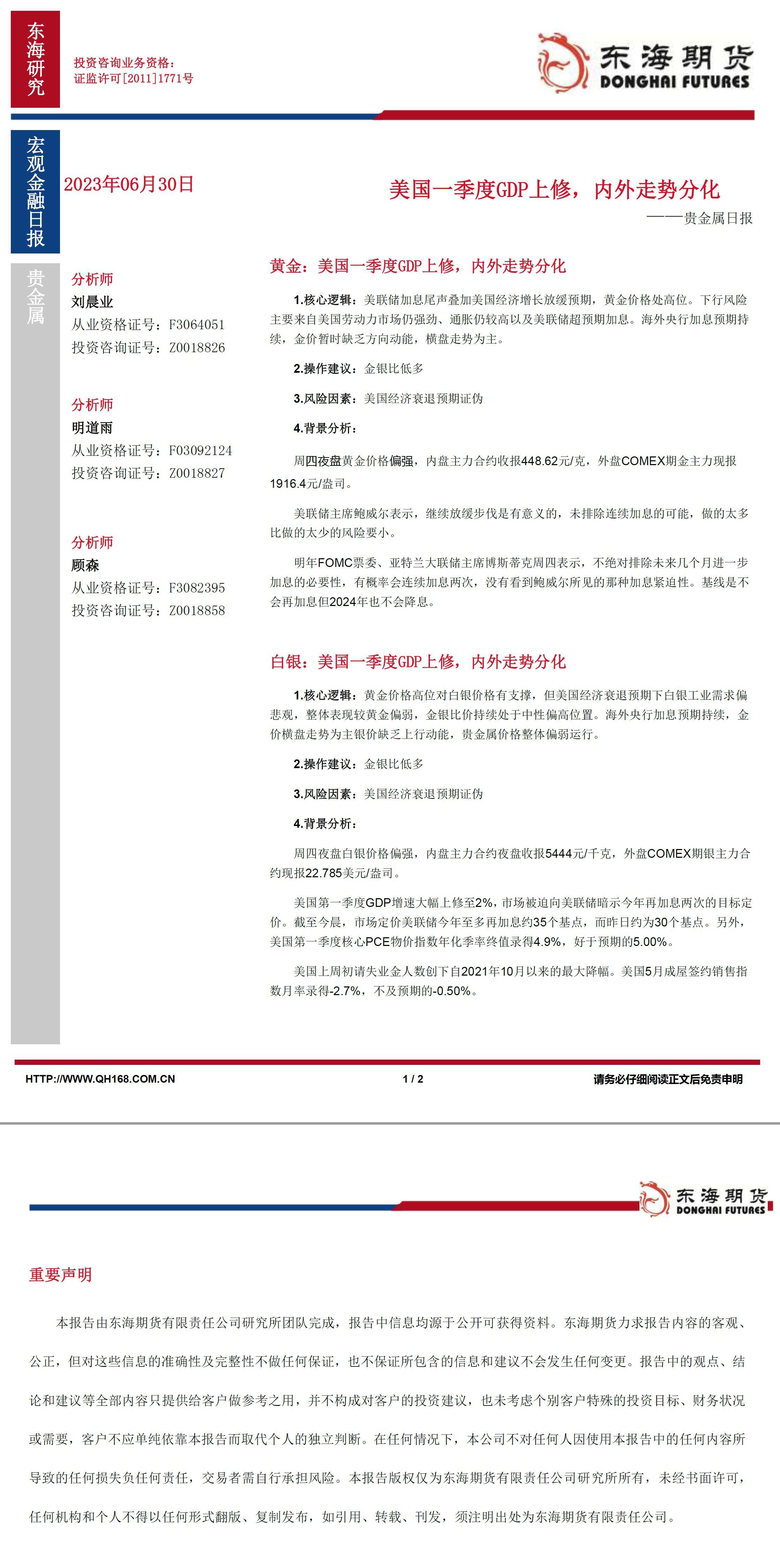 标题:【东海期货6月30日产业链日报】贵金属篇:美国一季度GDP上修,内外走势分化